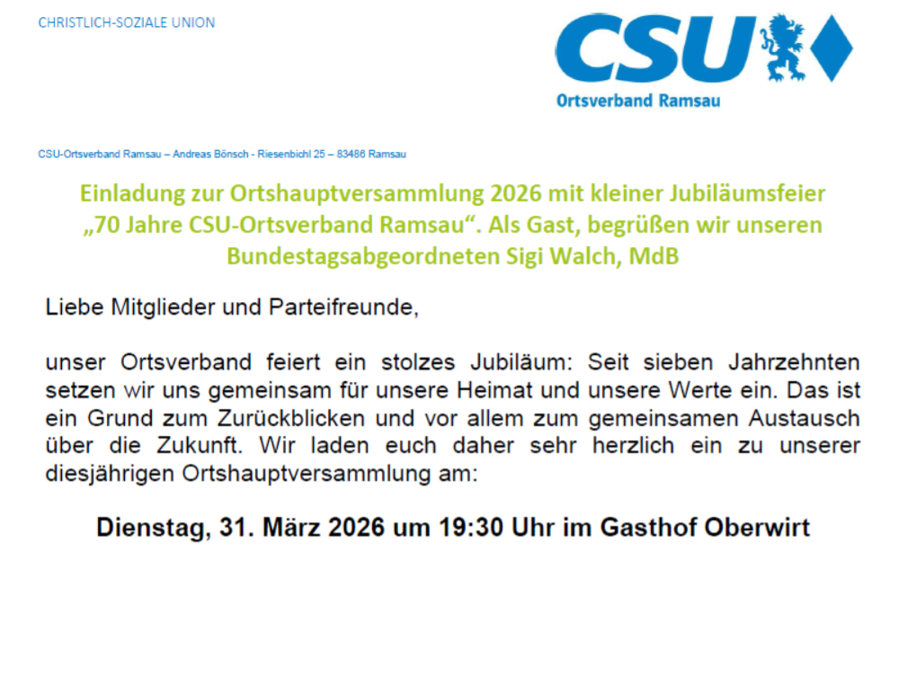 CSU-Ortsversammlung zur Nominierung des Bürgermeister-Kandidaten am 22.05.25
